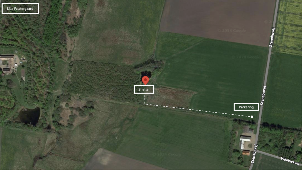Tæt på Arla® ØKO shelteret er der p-plads, og herfra fører marken til shelteret. Fra p-pladsen er der cirka 150 meter gennem et lettere kuperet landskab.