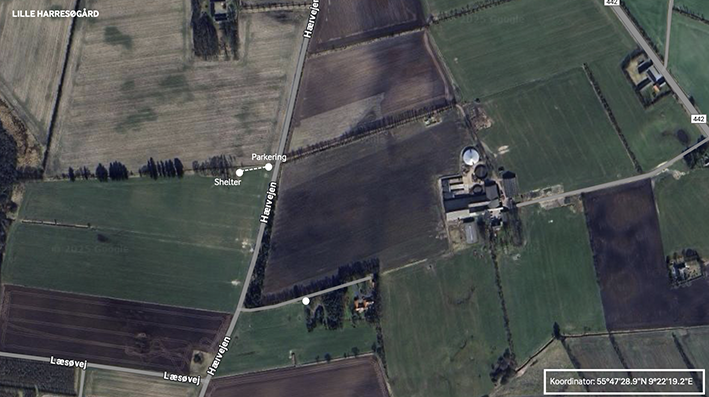 Tæt på Arla® ØKO shelteret er der p-plads, og herfra fører marken til shelteret. Fra p-pladsen er der cirka 100 meter gennem et lettere kuperet landskab.